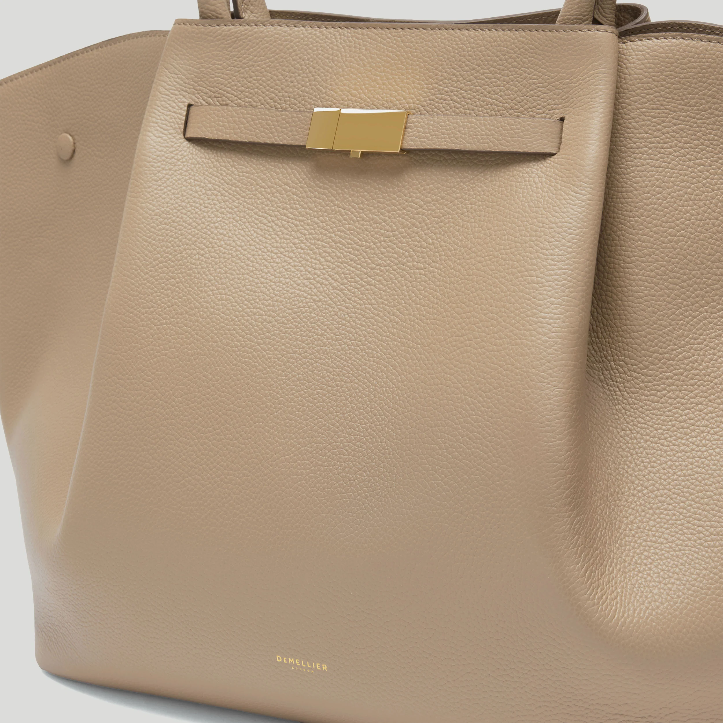 Exterior: Double top handles, metal feet, unique triangular fold design, foil embossed DeMellier logo.