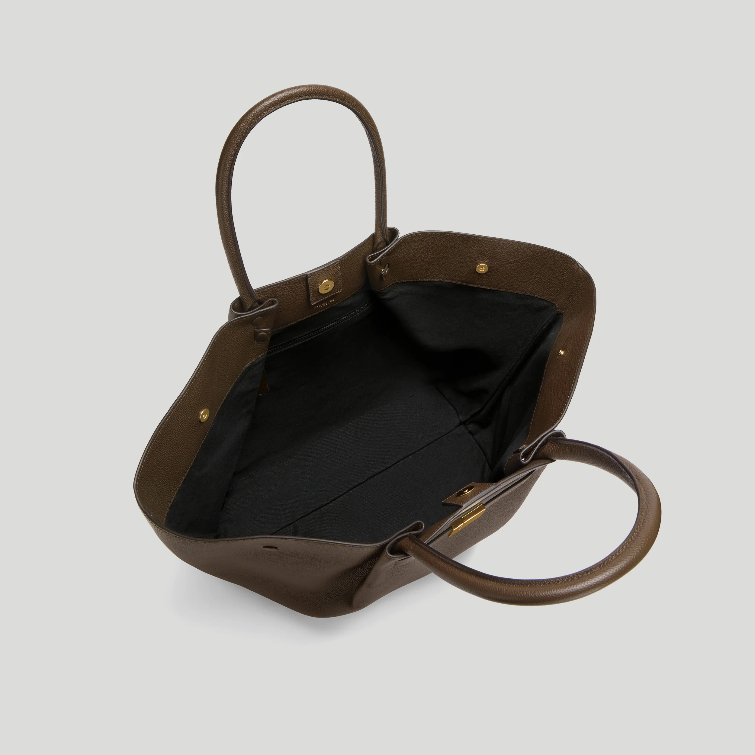 Exterior: Double top handles, metal feet, unique triangular fold design, foil embossed DeMellier logo.